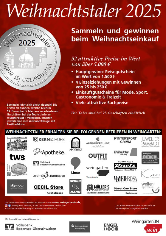Ab dem 22. November 2025 startet in Weingarten wieder die beliebte Weihnachtstaleraktion. In insgesamt 24 Geschäften können Kundinnen und Kunden beim Einkauf die festlich roten Taler sammeln und damit attraktive Preise gewinnen.